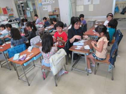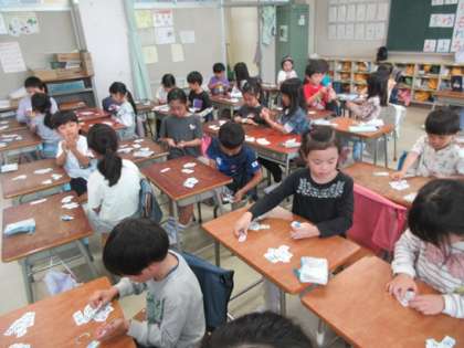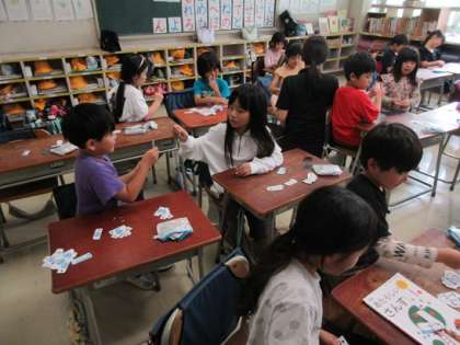 たし算カードを使って、友だちとゲームをしながら,たし算のやり方を確かめています。