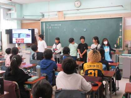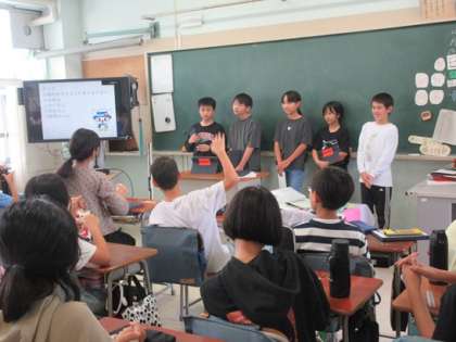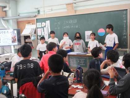 川場移動教室の報告会を全学級で行いました。移動教室の行動班ごとに分かれての発表でした。