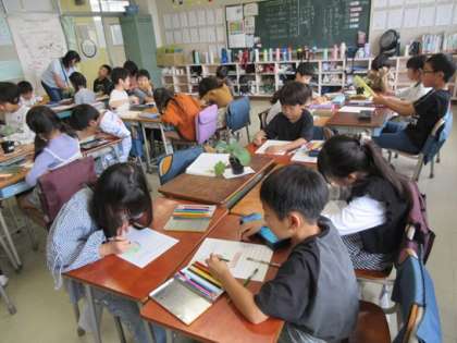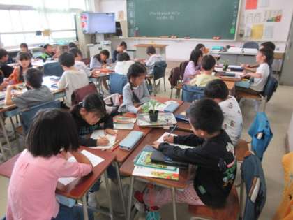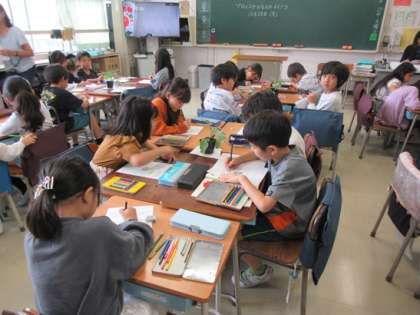 ブロッコリーの苗を観察し、観察カードを製作します。葉の色や形をよく見ています。
