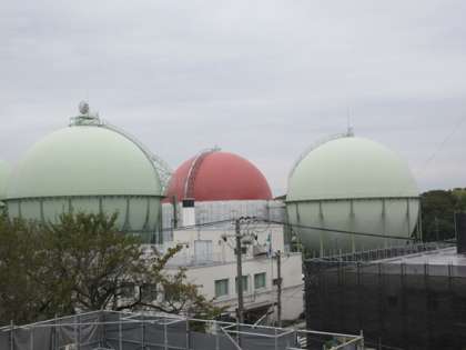 先週末から、校舎北側にあるガスタンクの一つが赤くなっています。