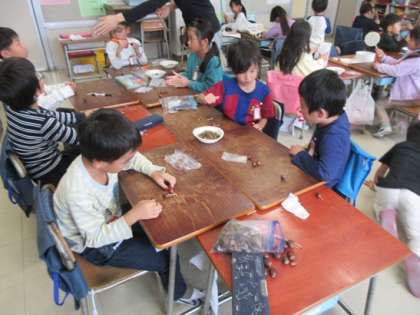 遠足で集めてきたどんぐりを使ったおもちゃの製作です。