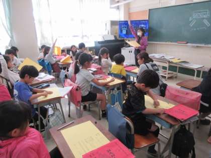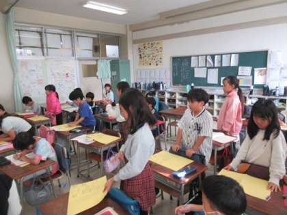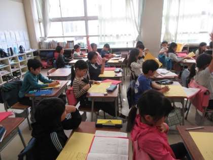 学芸会に向けてそれぞれが、頑張ることをカードに書いています。