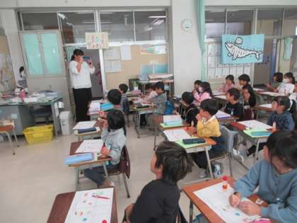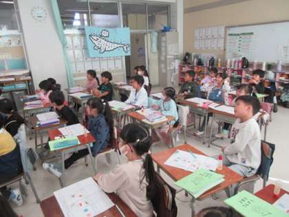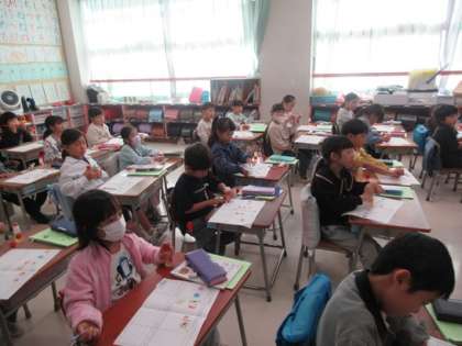 積み木を見ながら、はこのかたちのなかま分けをしています。「さいころ」や「ましかく」「ながしかく」などという言葉で出発です。