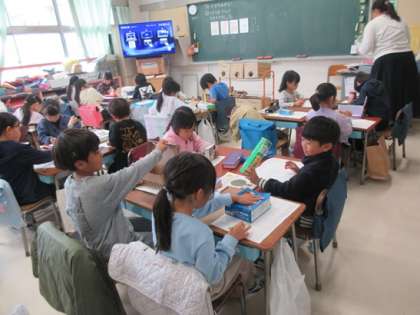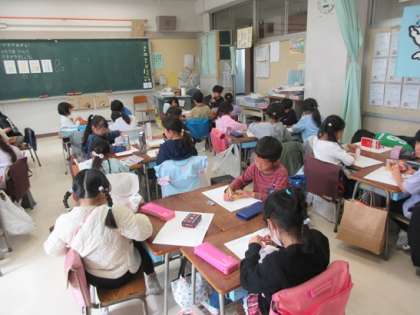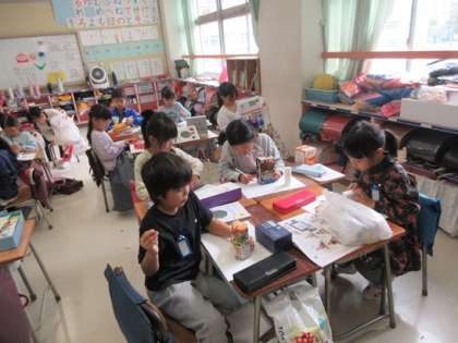 いろいろな形や大きさの箱を、プリントに書き写しています。上手にかけたかな?