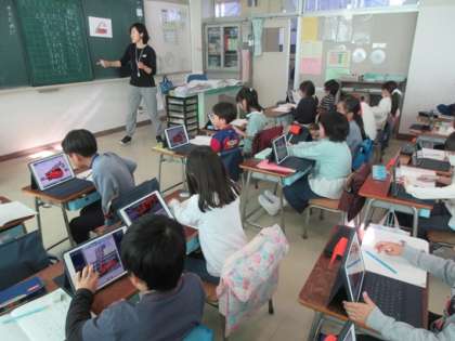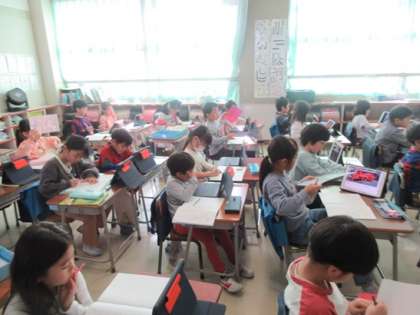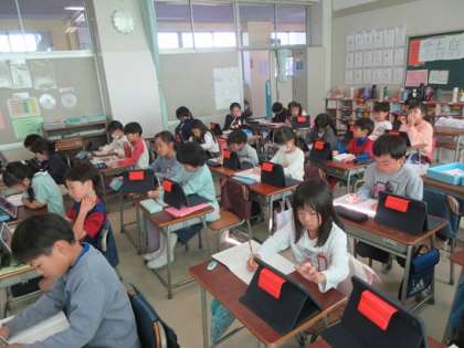 「じどう車調べ」の学習で、消防車について詳しく調べています。タブレットも上手に利用しています。