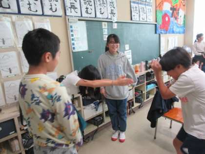 先生からグループごとに故事成語が示され、ジェスチャーを使って説明をします。