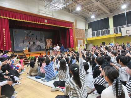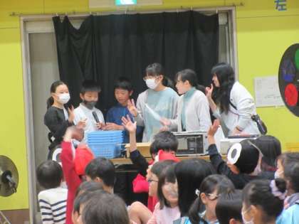 集会委員会の6年生による、幕間の時間です。次の学年が準備している短い時間を使っての活動でした。