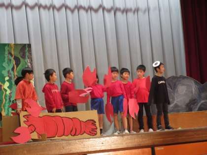 一人ぼっちのスイミーが出会う、様々な海のなかまたちです。道具や衣装を工夫して、演技しています。