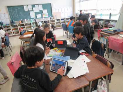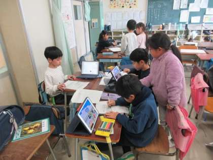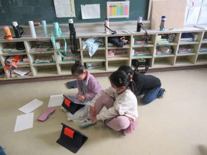 町たんけんのまとめです。グループに分かれて、大きな画用紙に整理していきます。