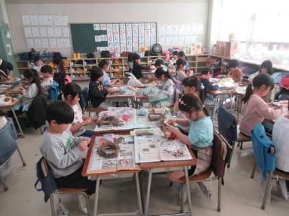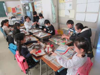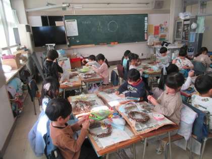 浅賀を利用したクリスマスリースを製作しています。彩りがとてもカラフルです。