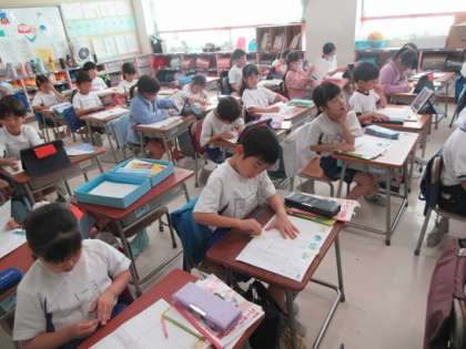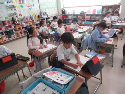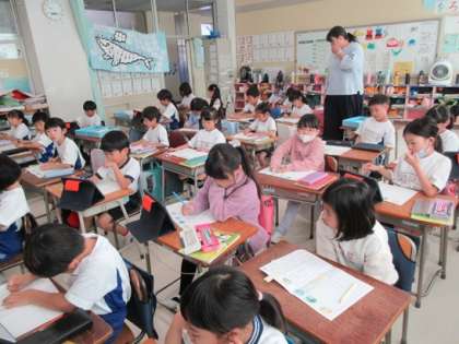 「たぬきの糸車」の話を場面分けして、あらすじを確かめています。