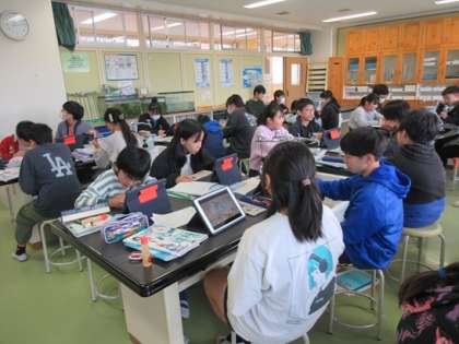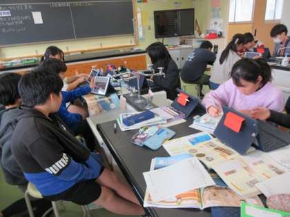 地層の学習が進んでいます。教科書やタブレットを使い、実験の準備です。