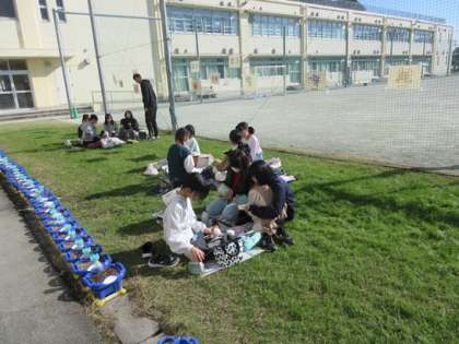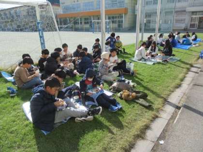 今日は5年生が、職員室前の芝生で、お弁当を食べました。