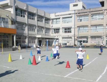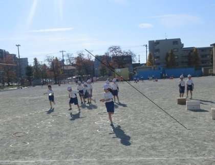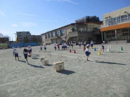 段ボール、ゴム、ミニハードルを使って、跳び越しの遊びです。高さや用具に合わせて跳び方を工夫します。