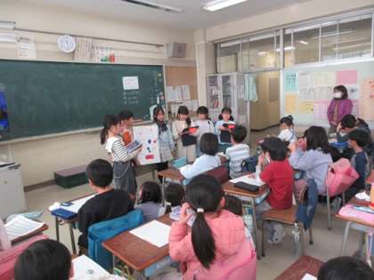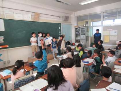 今日は3組の子ども達が、1組と2組で報告会をしました。発表の仕方がとても工夫されていました。