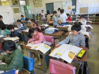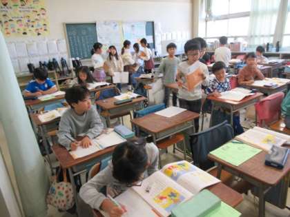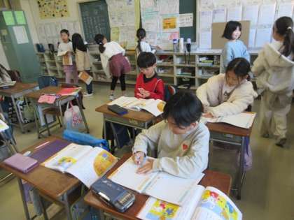 道徳ノートを使っています。自分の考えを書いた後に、友だちのノートを見て、自分の意見とくらべたり、取り入れたりしています。