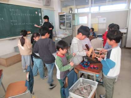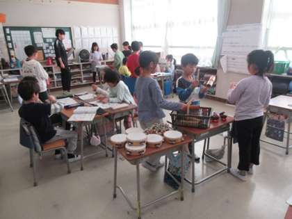 いろいろな音を出す打楽器があります。実際に音を出して、音色を確かめています。