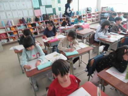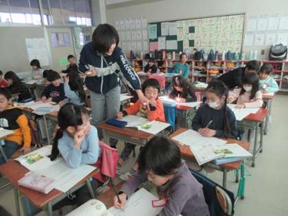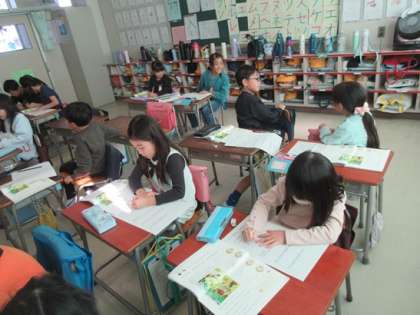 教科書の挿絵をいかして、登場人物を考え、お話づくりをしていました。
