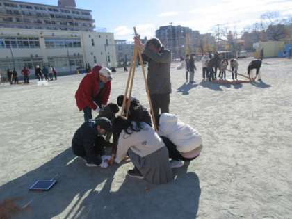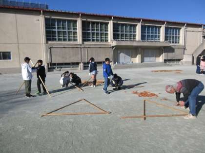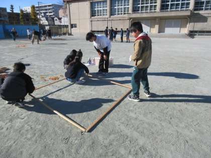 使うのは、2種類の長さの角材と幅の大きなゴムです。四角形や三角形などの最初の形を作っていきます。