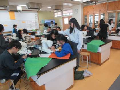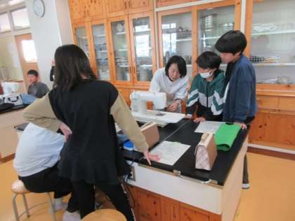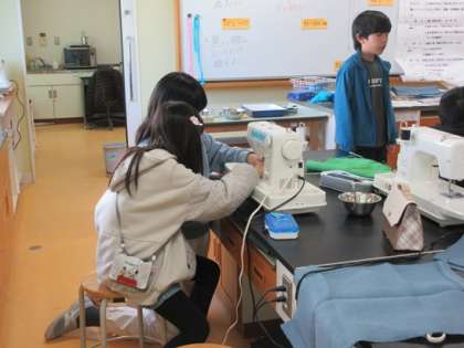 ミシンを利用した裁縫実習で、ウォールポケットを製作しています。