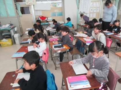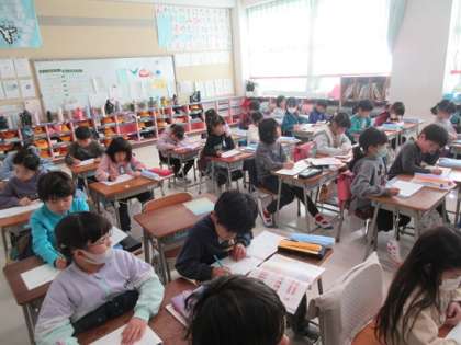 一の位、十の位などの用語や位取りの位置を確かめながら、ノートに書き写しています。