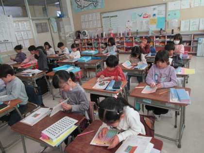 1から100までの数の表をもとに、十進数の仕組みや決まりを考えています。