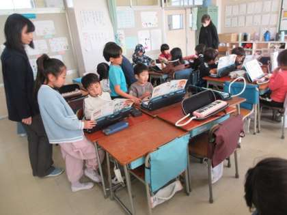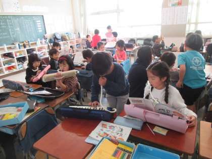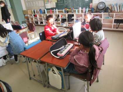 班ごとに分かれて、鍵盤ハーモニカの練習です。友達に教えてもらったり、合わせて演奏したりしています。