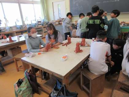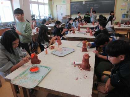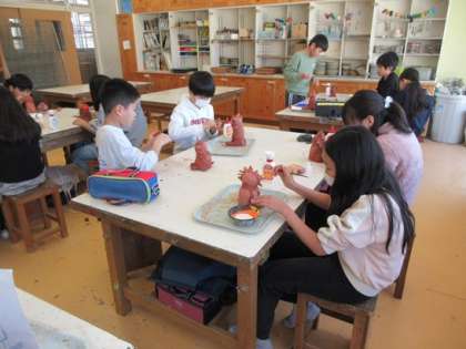 シーサーづくりに取り組んでいる4年生です。完成に近づいている子がたくさんいます。千差万別の姿に、笑顔が見えます。