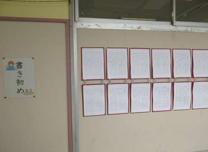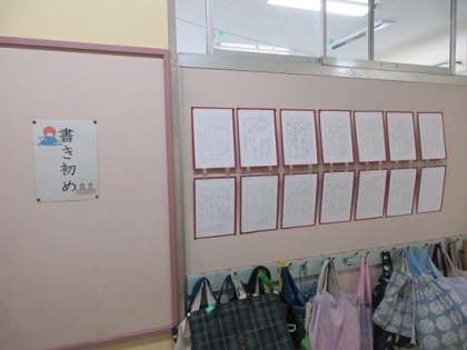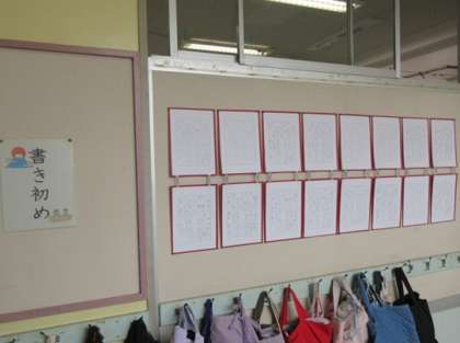 2年生の書初めは、2階の教室前の廊下掲示板です。一文字一文字がしっかりとかけています。