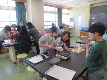 理科室にはいいると試験管に青い液体が入っていました。子ども達に聞いてみると「温めるとピンク色にかわります」と答えが返り、実際に実験を見せてくれました。すると、子ども達の言うとおりに、温度の変化とともに色が変わりました。