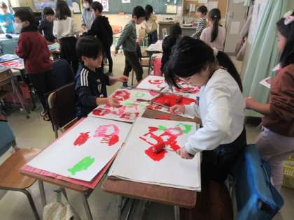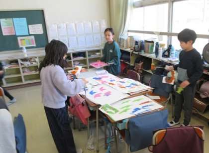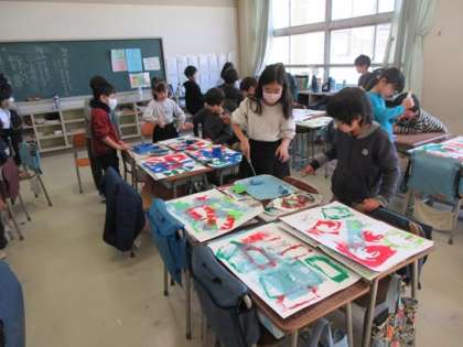 片貫をした画用紙と絵の具のローラーを使って、カラフルな作品ができ上っていきます。