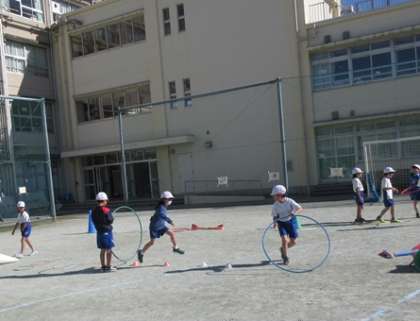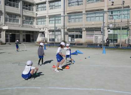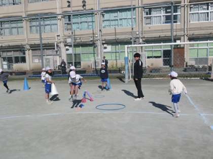 障害物層のコースを工夫しています。体育の中で使ういろいろな用具を利用しています。