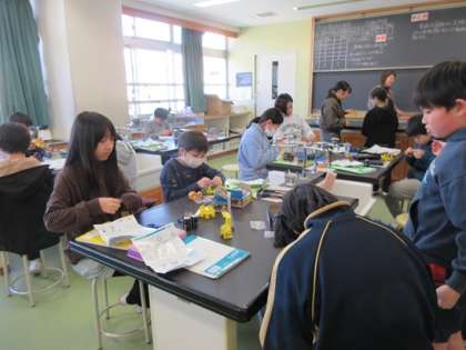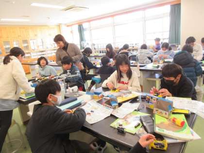コイルの中を電流が流れると磁力が発生する性質を利用した実験です。小さなコイルがくるくると回り始めると子ども達は大興奮です。
