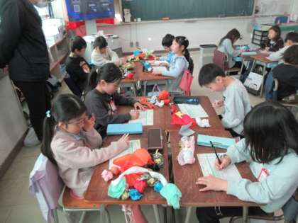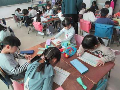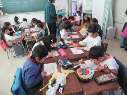 何色かの花紙をくしゃくしゃにして作品を作りました、工夫したところや苦労したところなどを振り返ります。