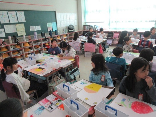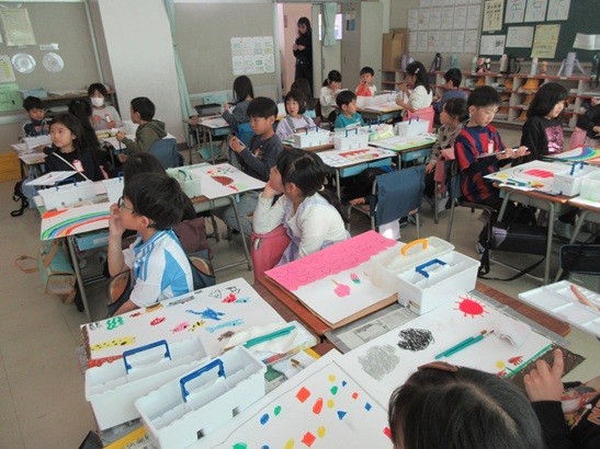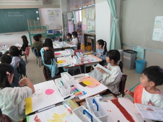 クレパスでいろいろな形を描いた後に、水彩絵の具で背景に色を付けます。