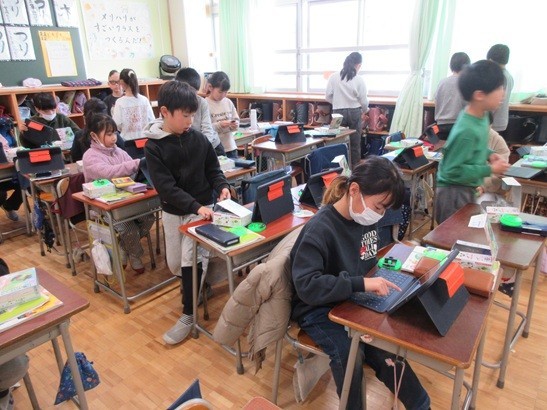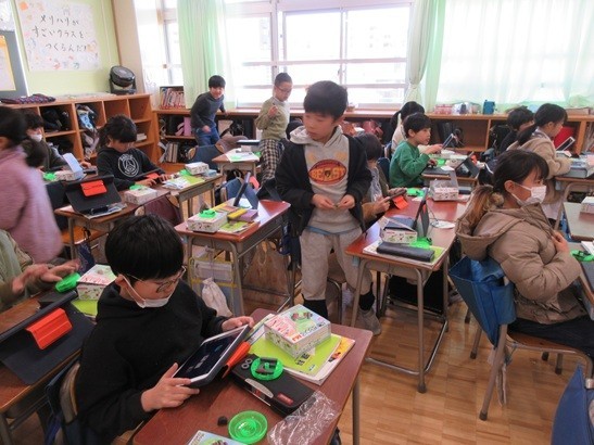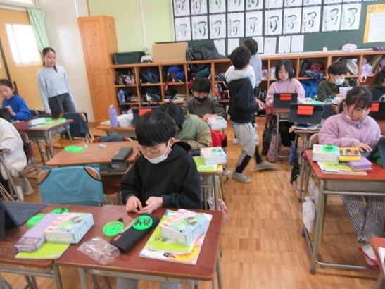いろいろな形のフェライト磁石の入っている実験キットを使い、教室のあちらこちらで、つくか/つかないかを確かめています。