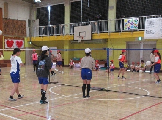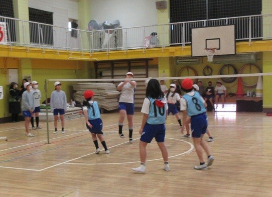 体育館内では、キャッチバレーボールで対抗戦です。一球一球に、互いの声を掛け合い、ネットを挟んで熱戦が繰り広げられました。