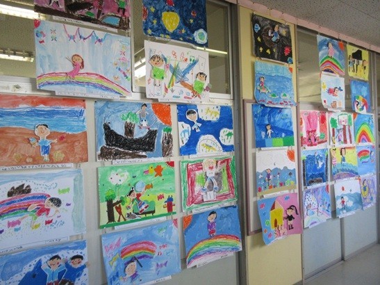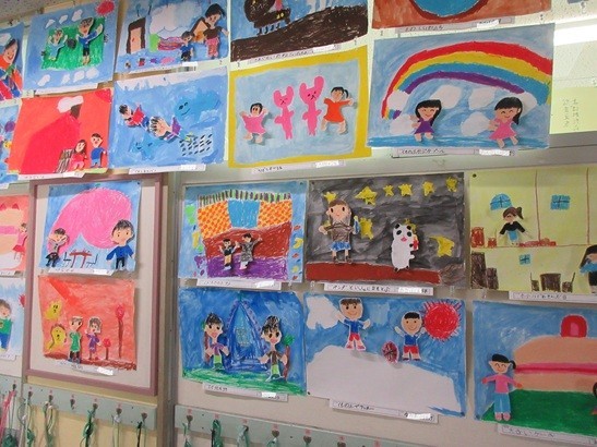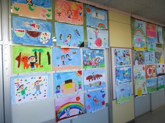 1年生の図工の作品が掲示されています。