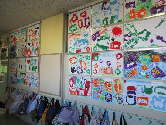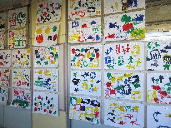 2年生の図工作品です。色とりどりの水彩絵の具でスタンプを押したようで、はらぺこ青虫の世界を想像します。