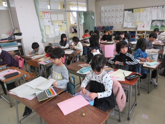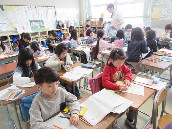 「いいこといっぱい1年生」の作品に、自分でイラストなどを描き表紙を作ります。一人一人の個性が垣間見えます。