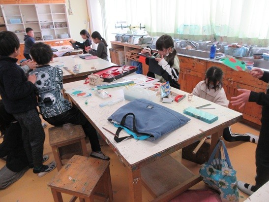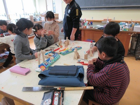 小さな木材をのこぎりで切ったり、ボンドで貼り合わせたりするなどして、いろいろなものを作りました。