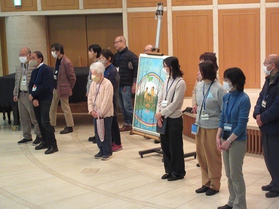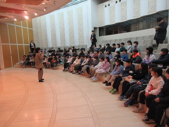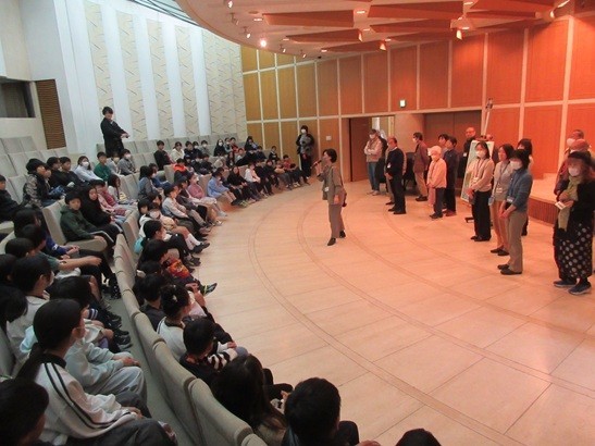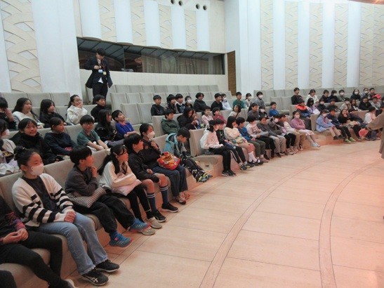 最初に入ったホールで鑑賞関する説明を受けました。そこには、千歳台小の鑑賞教室で用意してくださる、正門前にあった壁画の原画を見せていただきました。ログハウスの複製画とは一味違う絵に子ども達も見入っていました。