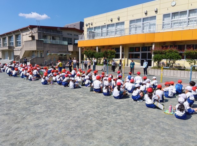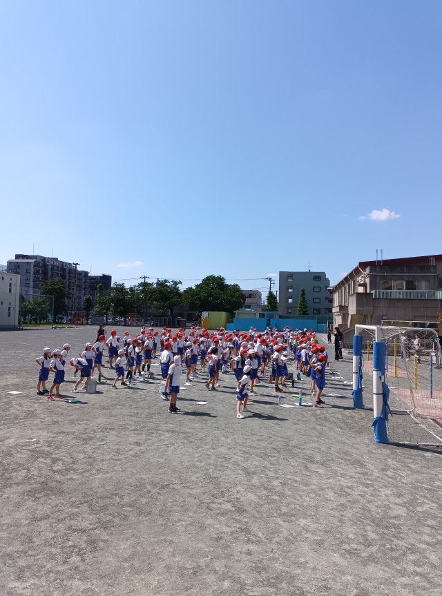 青空の下、体力テストが始まりました。お手伝いの保護者の方々にもお越しいただいています。