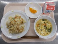 【献立】・チリビーンズごはん・じゃがいもののバリバリサラダ・ABCスープ・牛乳