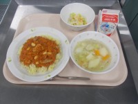 【献立】・ポークビーンズライス・コーンサラダ・ポテトスープ・牛乳
