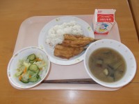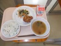 【献立】・わかめごはん・鶏肉のから揚げ・野菜ののりあえ・なめこいりみそ汁・牛乳