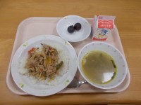 【献立】・カラフルチンジャオロース丼・にらとベーコンのスープ・果物(巨峰)牛乳