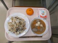 【献立】・かりかりお豆のひじきごはん・あじのつみれ汁・冷凍みかん・牛乳
