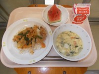 【献立】・チキンライス・かぼちゃと豆乳のスープ・かぼちゃのケーキ・牛乳