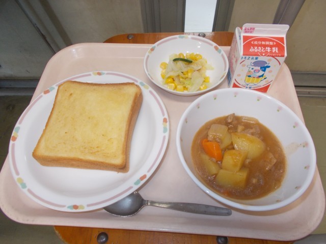 【献立】・フレンチトースト・ビーンズシチュー・れんこんチップサラダ・牛乳